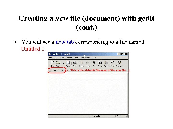 Creating a new file (document) with gedit (cont. ) • You will see a new tab corresponding to a file named Untitled 1: