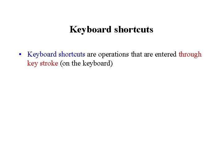 Keyboard shortcuts • Keyboard shortcuts are operations that are entered through key stroke (on the keyboard)