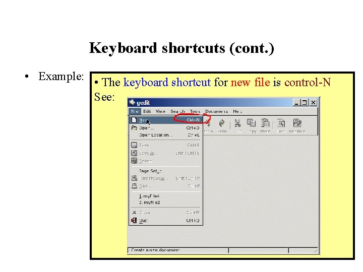 Keyboard shortcuts (cont. ) • Example: • The keyboard shortcut for new file is control-N See: