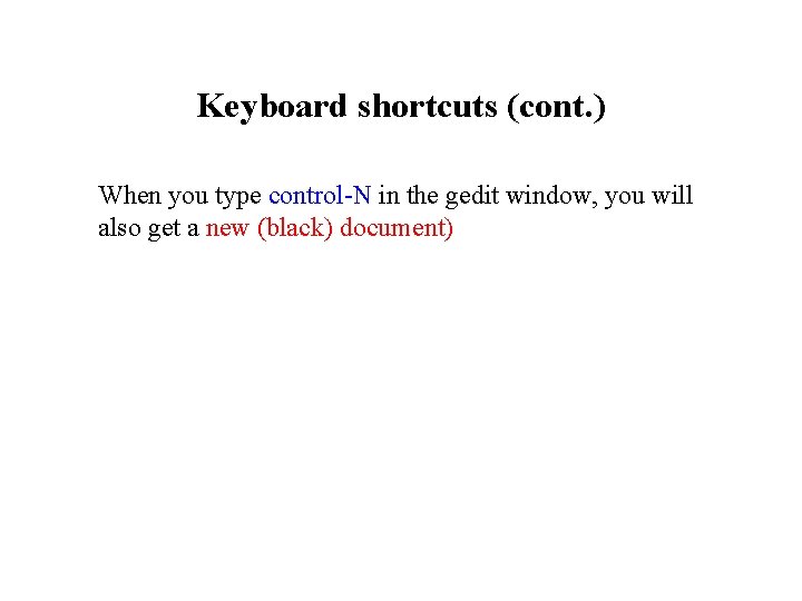Keyboard shortcuts (cont. ) When you type control-N in the gedit window, you will also get a new (black) document)