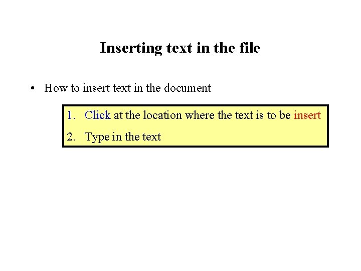 Inserting text in the file • How to insert text in the document 1. Click at the location where the text is to be insert 2. Type in the text