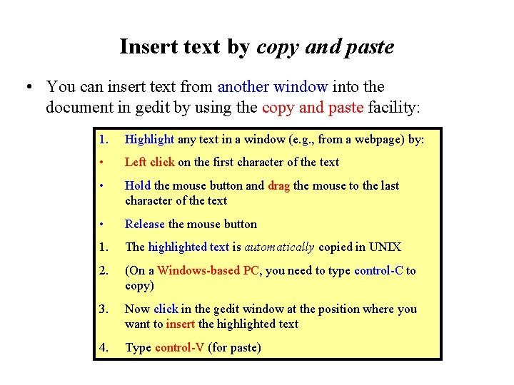 Insert text by copy and paste • You can insert text from another window into the document in gedit by using the copy and paste facility: 1. Highlight any text in a window (e. g. , from a webpage) by: • Left click on the first character of the text • Hold the mouse button and drag the mouse to the last character of the text • Release the mouse button 1. The highlighted text is automatically copied in UNIX 2. (On a Windows-based PC, you need to type control-C to copy) 3. Now click in the gedit window at the position where you want to insert the highlighted text 4. Type control-V (for paste)