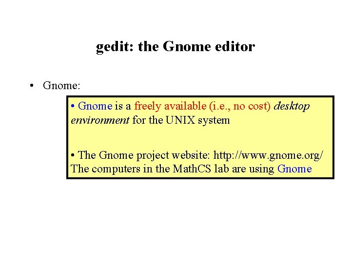 gedit: the Gnome editor • Gnome: • Gnome is a freely available (i. e. , no cost) desktop environment for the UNIX system • The Gnome project website: http: //www. gnome. org/ The computers in the Math. CS lab are using Gnome