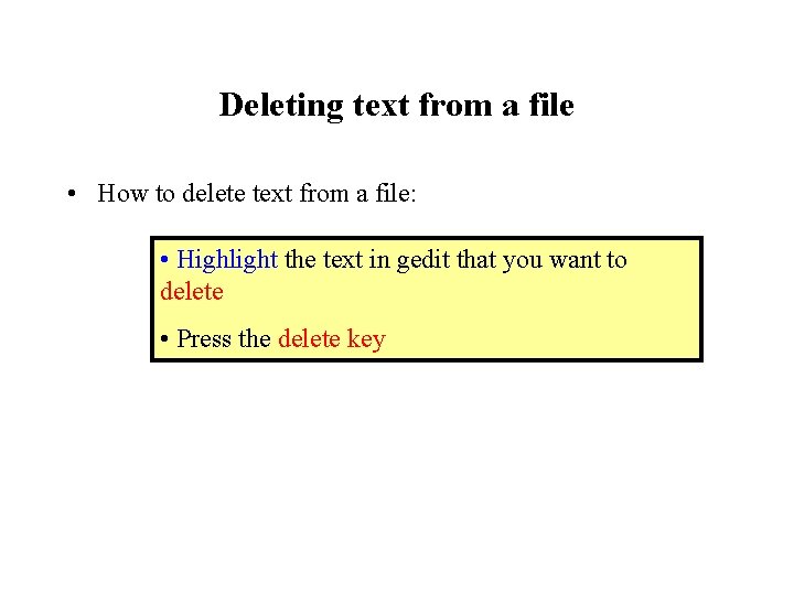 Deleting text from a file • How to delete text from a file: • Highlight the text in gedit that you want to delete • Press the delete key