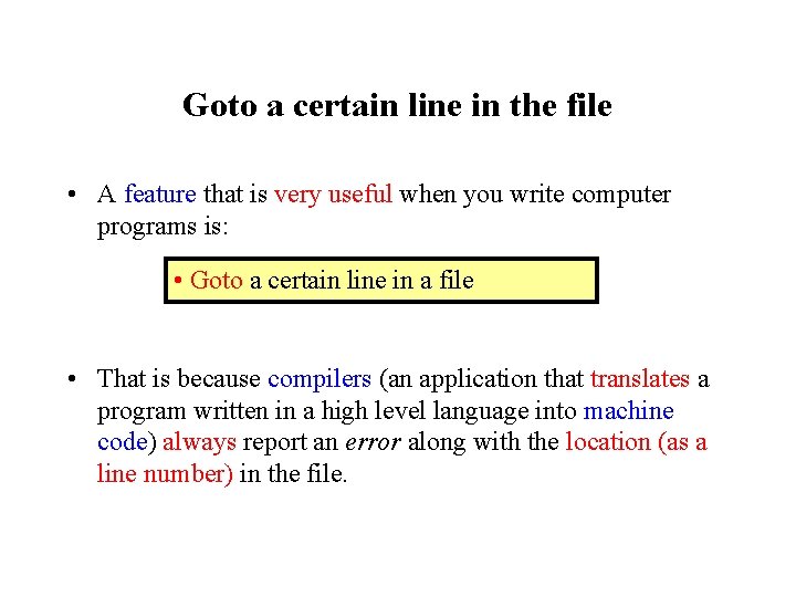 Goto a certain line in the file • A feature that is very useful when you write computer programs is: • Goto a certain line in a file • That is because compilers (an application that translates a program written in a high level language into machine code) always report an error along with the location (as a line number) in the file.