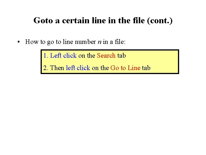 Goto a certain line in the file (cont. ) • How to go to line number n in a file: 1. Left click on the Search tab 2. Then left click on the Go to Line tab