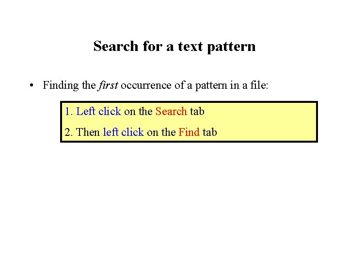 Search for a text pattern • Finding the first occurrence of a pattern in a file: 1. Left click on the Search tab 2. Then left click on the Find tab