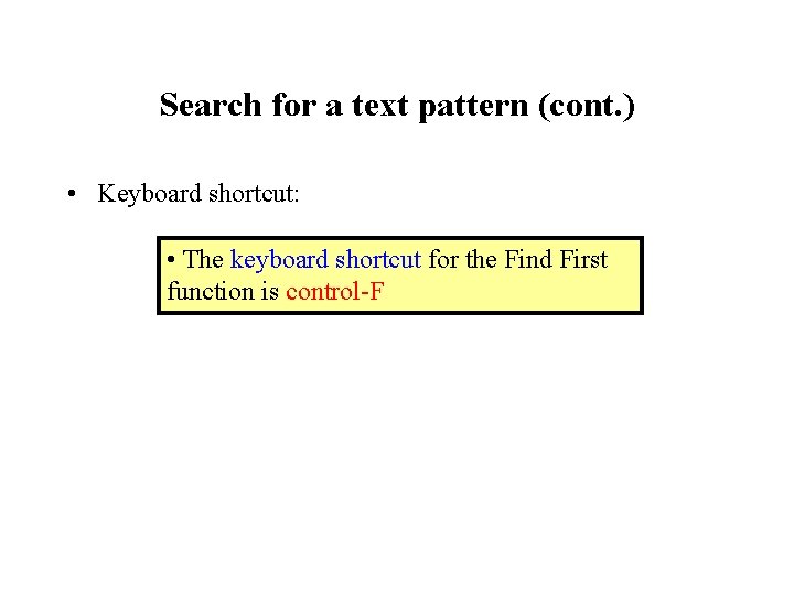 Search for a text pattern (cont. ) • Keyboard shortcut: • The keyboard shortcut for the Find First function is control-F
