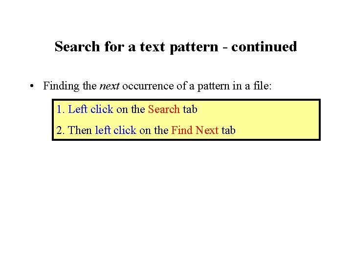 Search for a text pattern - continued • Finding the next occurrence of a pattern in a file: 1. Left click on the Search tab 2. Then left click on the Find Next tab