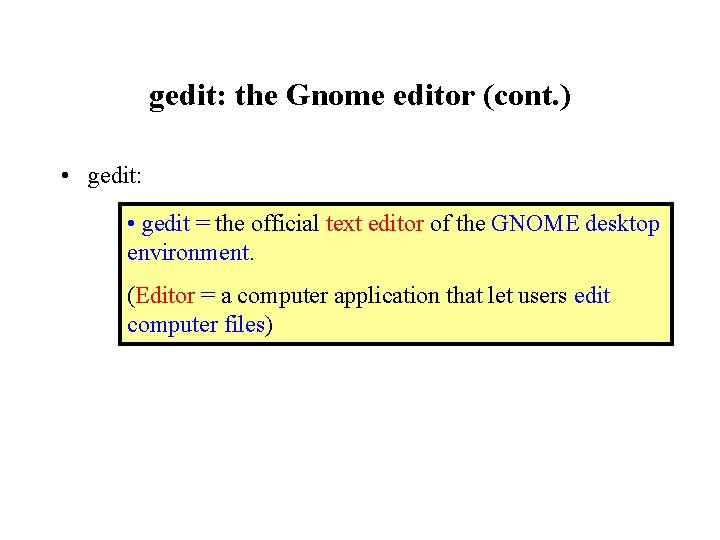 gedit: the Gnome editor (cont. ) • gedit: • gedit = the official text editor of the GNOME desktop environment. (Editor = a computer application that let users edit computer files)