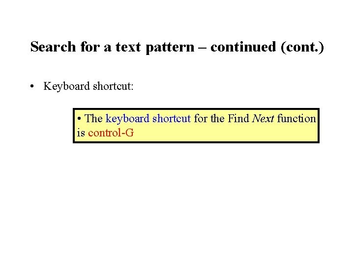 Search for a text pattern – continued (cont. ) • Keyboard shortcut: • The keyboard shortcut for the Find Next function is control-G
