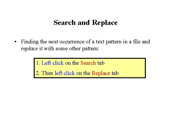 Search and Replace • Finding the next occurrence of a text pattern in a file and replace it with some other pattern: 1. Left click on the Search tab 2. Then left click on the Replace tab