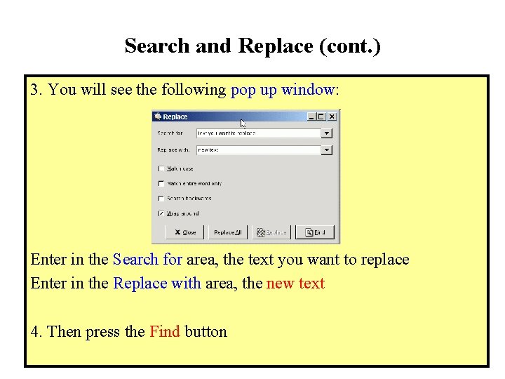 Search and Replace (cont. ) 3. You will see the following pop up window: Enter in the Search for area, the text you want to replace Enter in the Replace with area, the new text 4. Then press the Find button