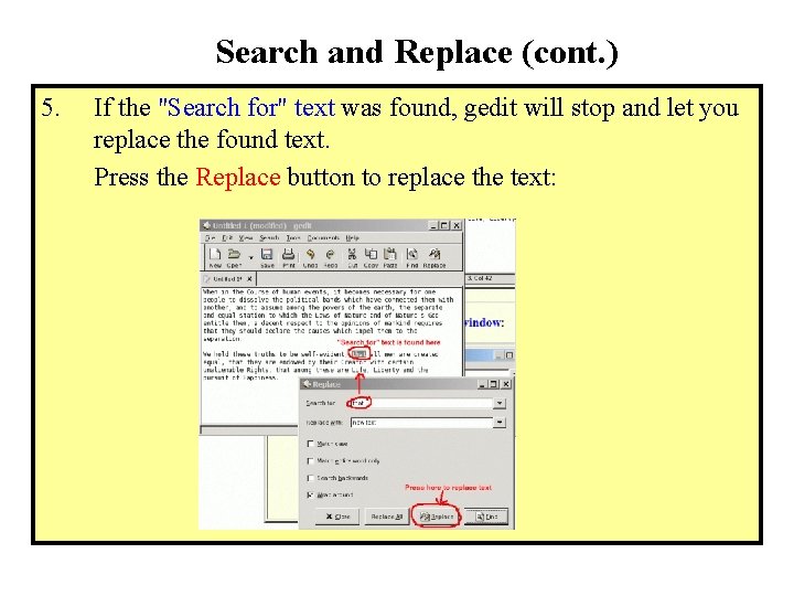 Search and Replace (cont. ) 5. If the "Search for" text was found, gedit will stop and let you replace the found text. Press the Replace button to replace the text: