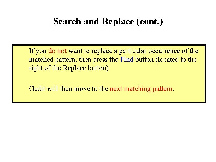 Search and Replace (cont. ) If you do not want to replace a particular occurrence of the matched pattern, then press the Find button (located to the right of the Replace button) Gedit will then move to the next matching pattern.