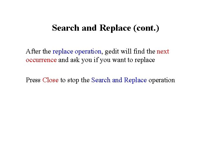 Search and Replace (cont. ) After the replace operation, gedit will find the next occurrence and ask you if you want to replace Press Close to stop the Search and Replace operation
