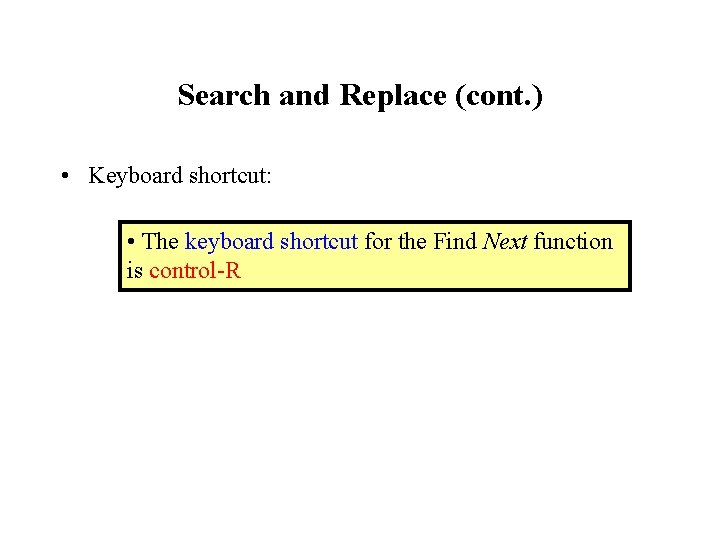 Search and Replace (cont. ) • Keyboard shortcut: • The keyboard shortcut for the Find Next function is control-R