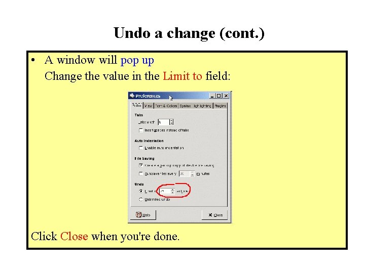 Undo a change (cont. ) • A window will pop up Change the value in the Limit to field: Click Close when you're done.