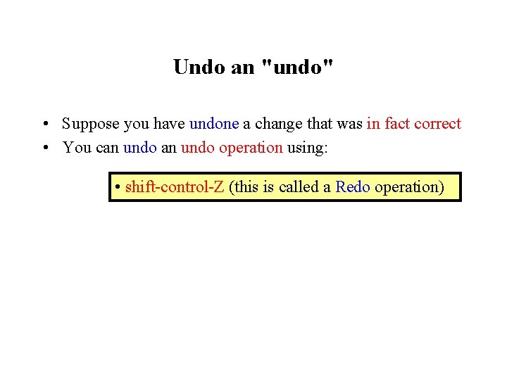 Undo an "undo" • Suppose you have undone a change that was in fact correct • You can undo operation using: • shift-control-Z (this is called a Redo operation)