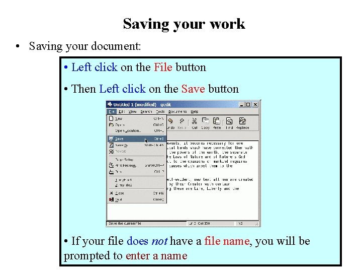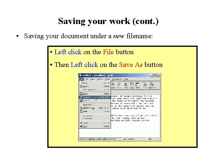 Saving your work (cont. ) • Saving your document under a new filename: • Left click on the File button • Then Left click on the Save As button