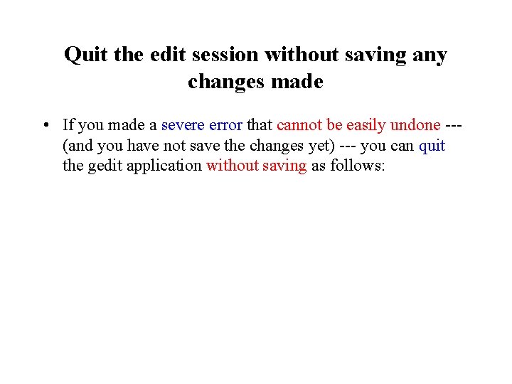 Quit the edit session without saving any changes made • If you made a severe error that cannot be easily undone --- (and you have not save the changes yet) --- you can quit the gedit application without saving as follows: