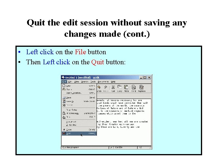 Quit the edit session without saving any changes made (cont. ) • Left click on the File button • Then Left click on the Quit button: