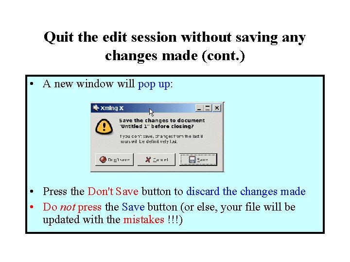 Quit the edit session without saving any changes made (cont. ) • A new window will pop up: • Press the Don't Save button to discard the changes made • Do not press the Save button (or else, your file will be updated with the mistakes !!!)