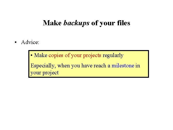 Make backups of your files • Advice: • Make copies of your projects regularly Especially, when you have reach a milestone in your project