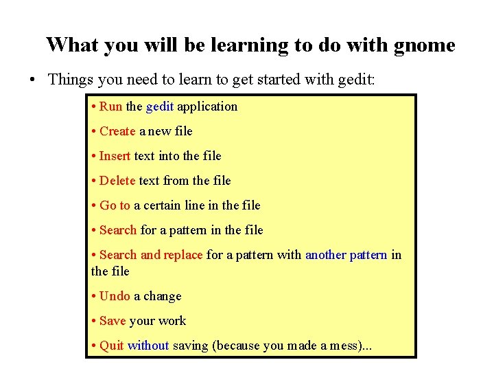 What you will be learning to do with gnome • Things you need to learn to get started with gedit: • Run the gedit application • Create a new file • Insert text into the file • Delete text from the file • Go to a certain line in the file • Search for a pattern in the file • Search and replace for a pattern with another pattern in the file • Undo a change • Save your work • Quit without saving (because you made a mess). . .