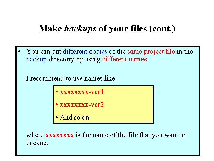 Make backups of your files (cont. ) • You can put different copies of the same project file in the backup directory by using different names I recommend to use names like: • xxxx-ver 1 • xxxx-ver 2 • And so on where xxxx is the name of the file that you want to backup.