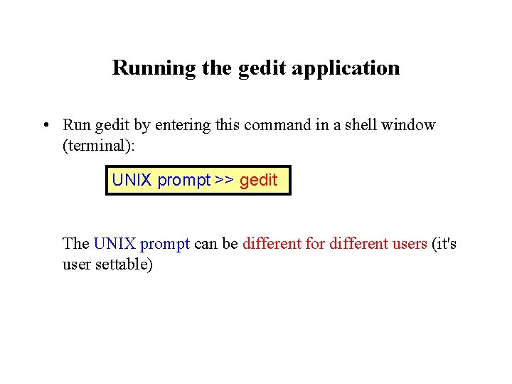 Running the gedit application • Run gedit by entering this command in a shell window (terminal): UNIX prompt >> gedit The UNIX prompt can be different for different users (it's user settable)