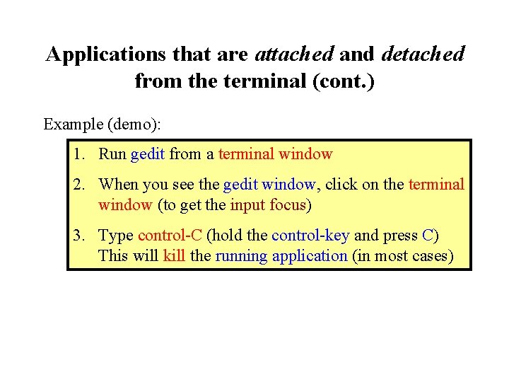 Applications that are attached and detached from the terminal (cont. ) Example (demo): 1. Run gedit from a terminal window 2. When you see the gedit window, click on the terminal window (to get the input focus) 3. Type control-C (hold the control-key and press C) This will kill the running application (in most cases)