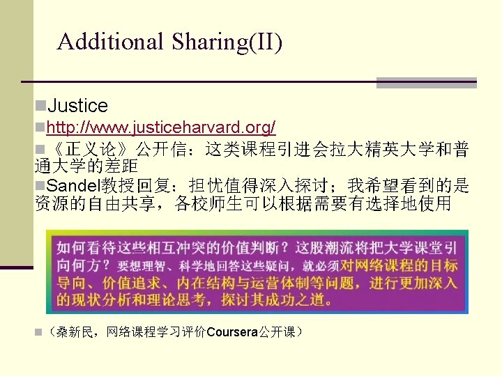 Additional Sharing(IV) n. Future university: Minerva nhttp: //www. justiceharvard. org/ n. Global Immersion n. Modern Curriculum n. Future Success n. Admission n(密涅瓦计划. http: //baike. baidu. com/link? url=x. P_Ut. PCMM 0 n 5 ATWwij. Re 0 Y- g. Cdzu 9 DFSu 8 z. N 3 ju. IHa. O 2 k. NE 23 -2 WIyk. Ilvqg-d. So. Cy. G 4 HBhth 6 diiy. Vx 61 ql 2 K)