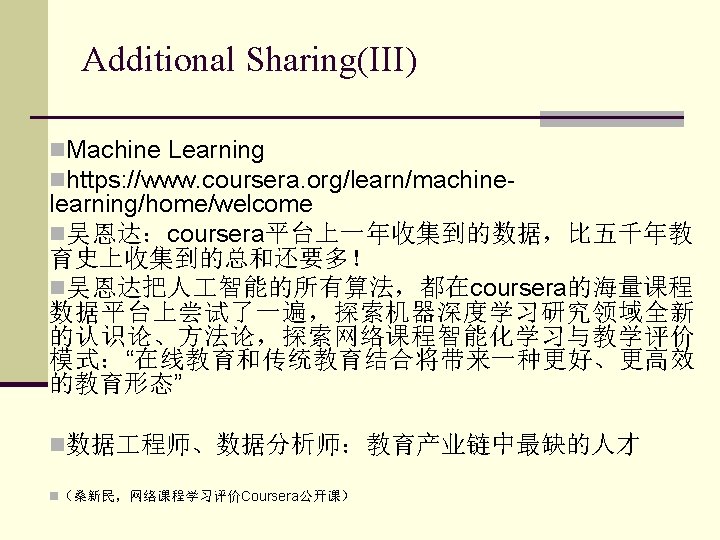 Additional Sharing(I) n乔布斯之问 n 20年来IT如何改变了几乎所有领域?为什么IT对 教育的影响小得令人吃惊? n schools are complex institutions that have proven to be amazingly resistant to change. (sawyer, 2014) n n 《美国 2010年国家教育技术计划》(NETP)指出信 息技术在教育领域的应用成效甚微在于其并未触及教 育系统的结构性变革 What do you think?