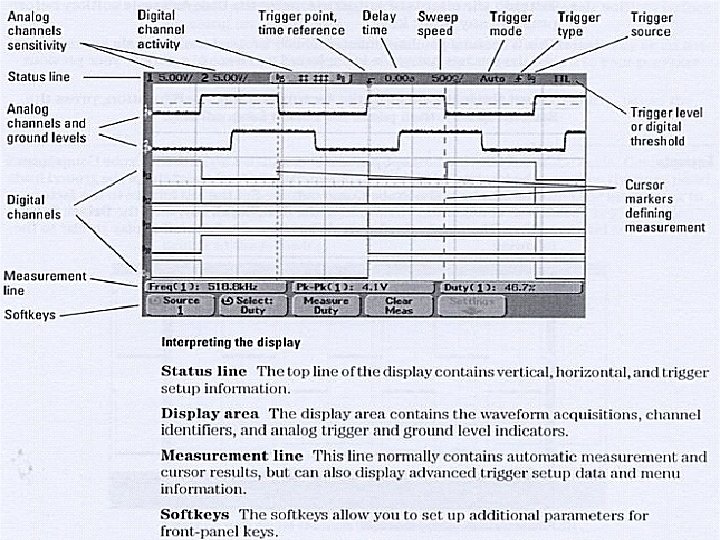 What's this triggering stuff? You want a repetitive signal to appear to stand still. • Normal Triggering Runs only if it sees a signal that can trigger it. If trigger level isn't set right—you see nothing! • Auto Triggering Free runs. Good for seeing if something is happening. • Auto Level Triggering Runs so long as there is a signal. If trigger level isn't set right—the scope adjusts it for you! (may not be such a good thing – there is no free lunch)