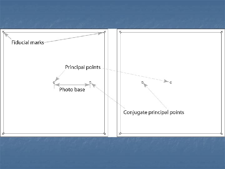 Terms related to aerial photos n n Fiducial marks: Reference marks on the corners and/or sides of aerial photos used to define coordinate axes and to locate the geometric center of the photo Principal point: The geometric center of the photo Conjugate principal point: The point representing the principal point of an adjacent photo Photo base: The distance between the principal point and the conjugate principal point