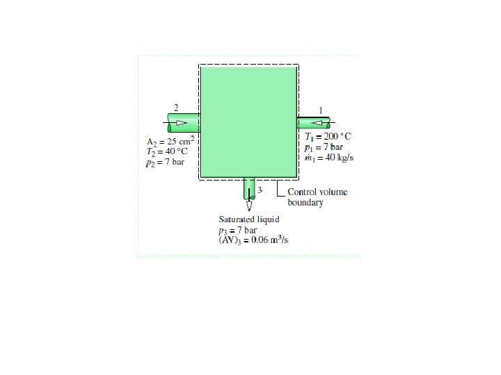 Pengisian Pemanas Air pada Keadaan Tunak Sebuah alat pengisian pemanas air mempunyai dua sisi masuk dan satu sisi keluar, beroperasi pada keadaan tunak. Pada sisi masuk 1, uap air masuk dengan tekanan p 1 = 7 bar, temperatur T 1 = 200 0 C dengan laju aliran massa 40 kg/s. Pada sisi masuk 2, air dengan tekanan p 2 =7 bar, temperatur T 2 = 40 0 C masuk melalui suatu luasan A 2 = 25 cm 2. Air keluar di titik 3 dalam kondisi cair jenuh (saturated liquid) dengan tekanan 7 bar dan laju aliran volumetris 0, 06 m 3 /s. Tentukan besarnya laju aliran massa pada sisi masuk 2 dan pada sisi keluar, dalam satuan kg/s, dan besarnya kecepatan pada sisi masuk 2, dalam satuan m/s