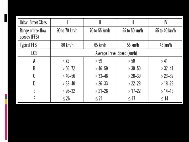 LOS determination Base condition: * lane width * lateral clearance * access frequency * terrain * traffic condition stream * driver population characteristics Steps: 1) Measure Free-flow speed from the field-is the mean speed of traffic as measured when flow rates are low to moderate 2) Analysis flow rate –the highest volume in a 24 -hr (the peak-hr volume) is used for V in traffic analysis computation. 3) Determine LOS