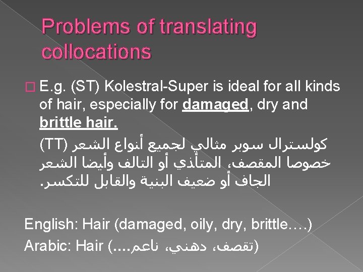 Problems of translating collocations � E. g. English: bad/good law. Arabic: ( ﻏﻴﺮ ﻋﺎﺩﻝ)ﻇﺎﻟﻢ / ﻗﺎﻧﻮﻥ ﻋﺎﺩﻝ English: hard drink Arabic: ( ﻣﺸﺮﻭﺑﺎﺕ ﺭﻭﺣﻴﺔ different distinctions)