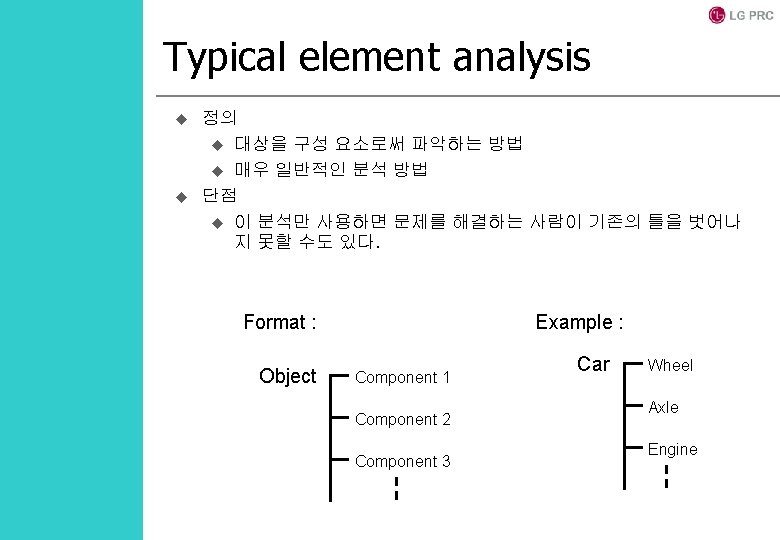 Typical and non typical problems u Typical problems from engineer viewpoint u u Typical problems from TRIZ viewpoint u u 지식을 통해 solutions이나 rules을 알고 있는 문제 경험을 통해 solutions이나 rules을 알고 있는 문제 동일 분야의 특허, EDB 등의 정보를 통해 알고 있는 문제 Engineer viewpoint에서 Non-Typical Problem을 포함 이러한 유형의 문제에 TRIZ는 Typical Solutions을 적용함 - 많은 발명가들의 경험으로부터 추출된 지식/원리/Rule 기술과제에 대한 Situation Modeling을 통해 Typical Problem으 로 변환할 수 있다. Non Typical problem u TRIZ의 typical solutions 이나 기존의 experience을 통해 이러한 유형의 문제를 해결할 수 없다.