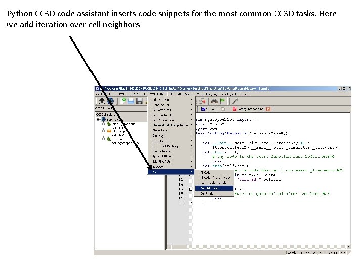 Python CC 3 D code assistant inserts code snippets for the most common CC 3 D tasks. Here we add iteration over cell neighbors