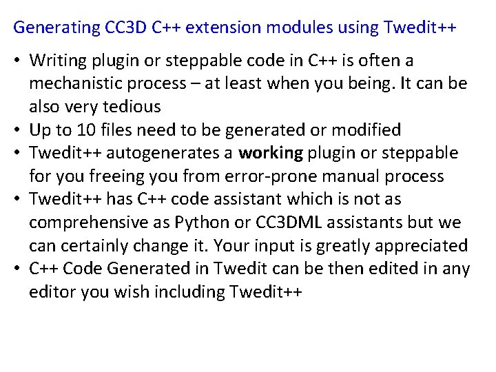 Generating CC 3 D C++ extension modules using Twedit++ • Writing plugin or steppable code in C++ is often a mechanistic process – at least when you being. It can be also very tedious • Up to 10 files need to be generated or modified • Twedit++ autogenerates a working plugin or steppable for you freeing you from error-prone manual process • Twedit++ has C++ code assistant which is not as comprehensive as Python or CC 3 DML assistants but we can certainly change it. Your input is greatly appreciated • C++ Code Generated in Twedit can be then edited in any editor you wish including Twedit++