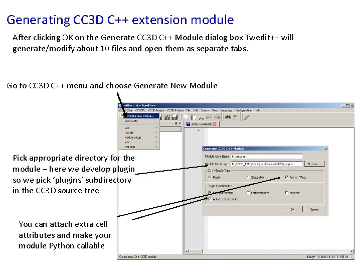 Generating CC 3 D C++ extension module After clicking OK on the Generate CC 3 D C++ Module dialog box Twedit++ will generate/modify about 10 files and open them as separate tabs. Go to CC 3 D C++ menu and choose Generate New Module Pick appropriate directory for the module – here we develop plugin so we pick ‘plugins’ subdirectory in the CC 3 D source tree You can attach extra cell attributes and make your module Python callable
