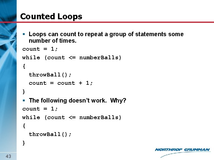Counted Loops § Loops can count to repeat a group of statements some number of times. count = 1; while (count <= number. Balls) { throw. Ball(); count = count + 1; } § The following doesn’t work. Why? count = 1; while (count <= number. Balls) { throw. Ball(); } 43