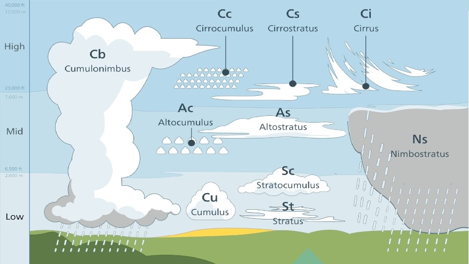 Clouds Cumulonimbus clouds: Tall, ominous-looking clouds that can become thunderstorms. Expect heavy rain, lightning, hail, and maybe even tornadoes when you see these clouds. Stratus clouds: Flat, grey clouds that cover the whole sky. These clouds usually produce drizzle or light rain. Fog: Fog is just a regular cloud that forms down at ground level. Fog typically forms when warm air blows over much colder soil or even snow.