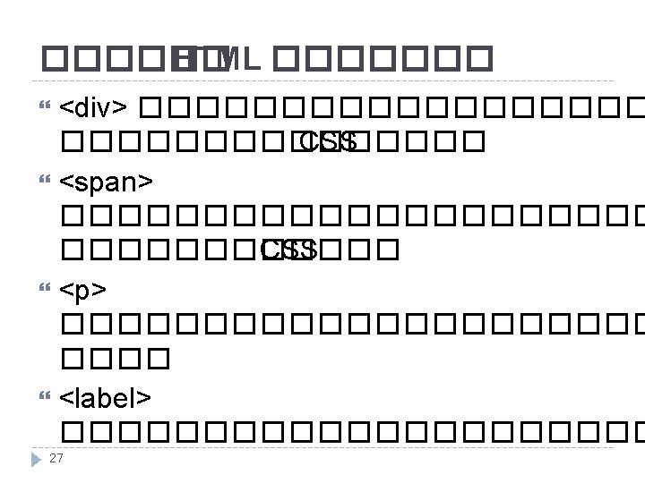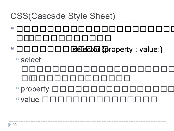 CSS Selector tag ���������� � �������� span {color: #00 ffff; } class ����������� ��� attribute class. green. Text {color: #00 ee 00; } id ���������� attribute id ������ #narrow. Block{width: 75 px; } 30