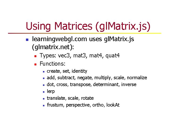 Using Matrices (gl. Matrix. js) n learningwebgl. com uses gl. Matrix. js (glmatrix. net): n n Types: vec 3, mat 4, quat 4 Functions: n n n create, set, identity add, subtract, negate, multiply, scale, normalize dot, cross, transpose, determinant, inverse lerp translate, scale, rotate frustum, perspective, ortho, look. At