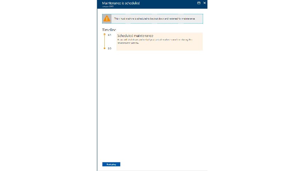 Introduction: Types of planned maintenance The majority of updates have no impact to hosted VMs. However, there are cases where updates to the hosting infrastructure result in interference to running VMs: • VM preserving maintenance (aka PHU- Preserving Host Updates) • The virtual machine is placed into a “paused” state • RAM, Network connection, open files remain open • Virtual machine is then resumed within 30 seconds • VM restarting maintenance • VM Reboot – VM is restarted. Memory, open files, network connections are lost • VM Redeploy – VM is moved to another host. Ephemeral drive is lost as well