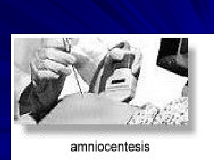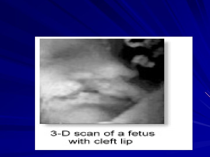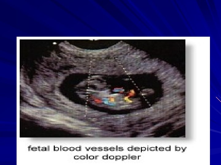Cont… First trimester ultrasonic 'soft' markers for chromosomal abnormalities such as the absence of fetal nasal bone, an increased fetal nuchal translucency (the area at the back of the neck) are now in common use to enable detection of Down syndrome fetuses. Ultrasound can also assist in other diagnostic procedures in prenatal diagnosis such as amniocentesis, chorionic villus sampling, cordocentesis (percutaneous umbilical blood sampling) and in fetal therapy.