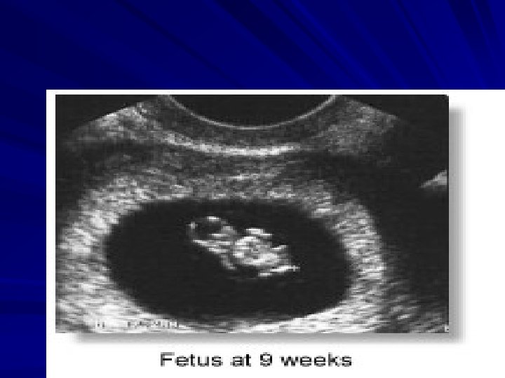 Cont… diagnose multiple pregnancies, such as twins or triplets rule out molar pregnancy, a situation in which the fetus itself becomes a tumor check for problems with the baby, including spina bifida, where the spine fails to close during development, or cleft palate, which is abnormal closure of the lip and roof of the mouth determine if the baby is alive and healthy, with good movement, heart function, and placement in the uterus